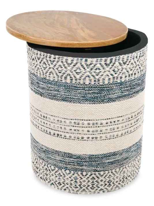 Yarns are handwoven and wrapped around the base of this side table that also functions as easy storage. A removable mango wood tabletop allows for ample storage space inside the table. Great for storing throws or children’s toys! Hand woven.