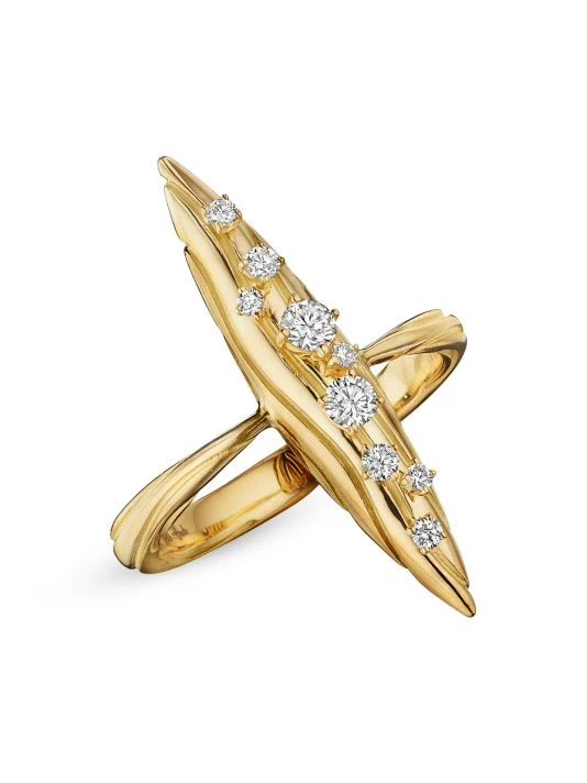 From the Bahia Collection. Designed with a unique center bar, this sculptural ring is embellished with glittering diamonds.
