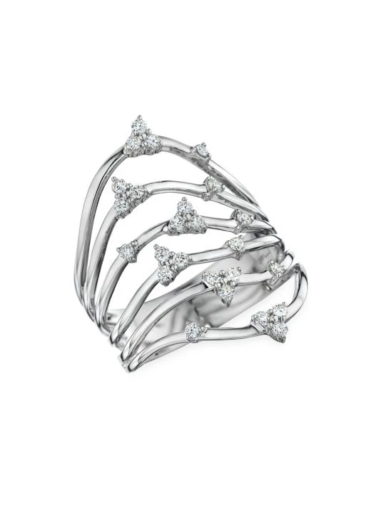 From the Luminus Collection. Made by skilled artisans, Hueb’s stunning 18K-white-gold ring features a wide, wavy silhouette embellished with brilliant diamond clusters.