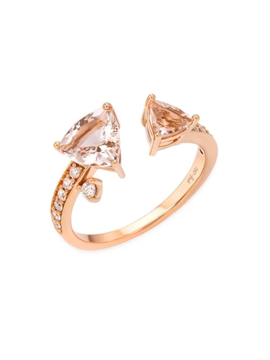 From the Mirage Collection. Diamonds encircle the band of this glittering rose gold ring, designed with an open shape and centered by trillion rose morganite stones.