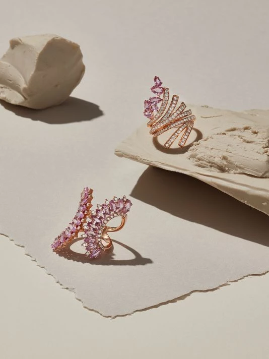 - Statement fan-shaped ring with marquis pink sapphire.
